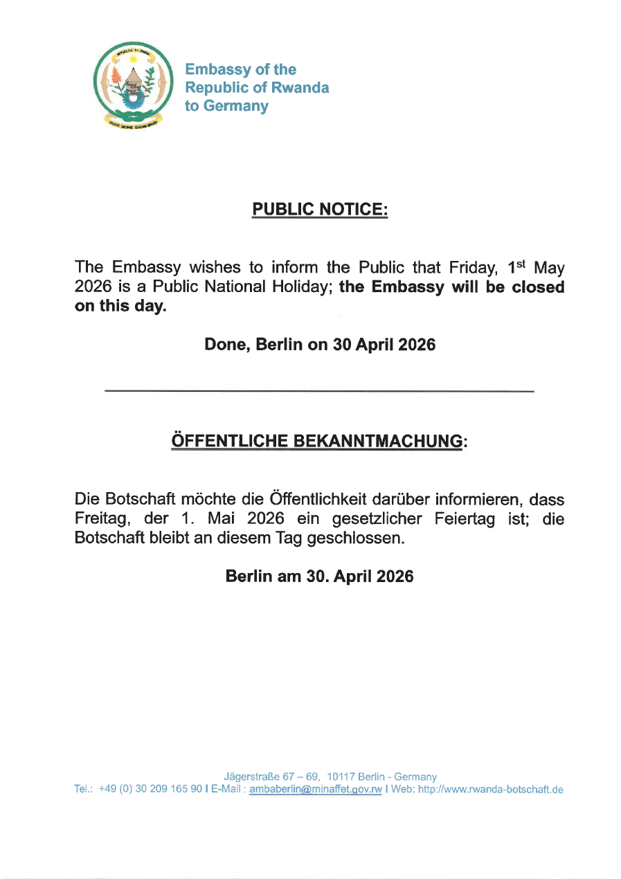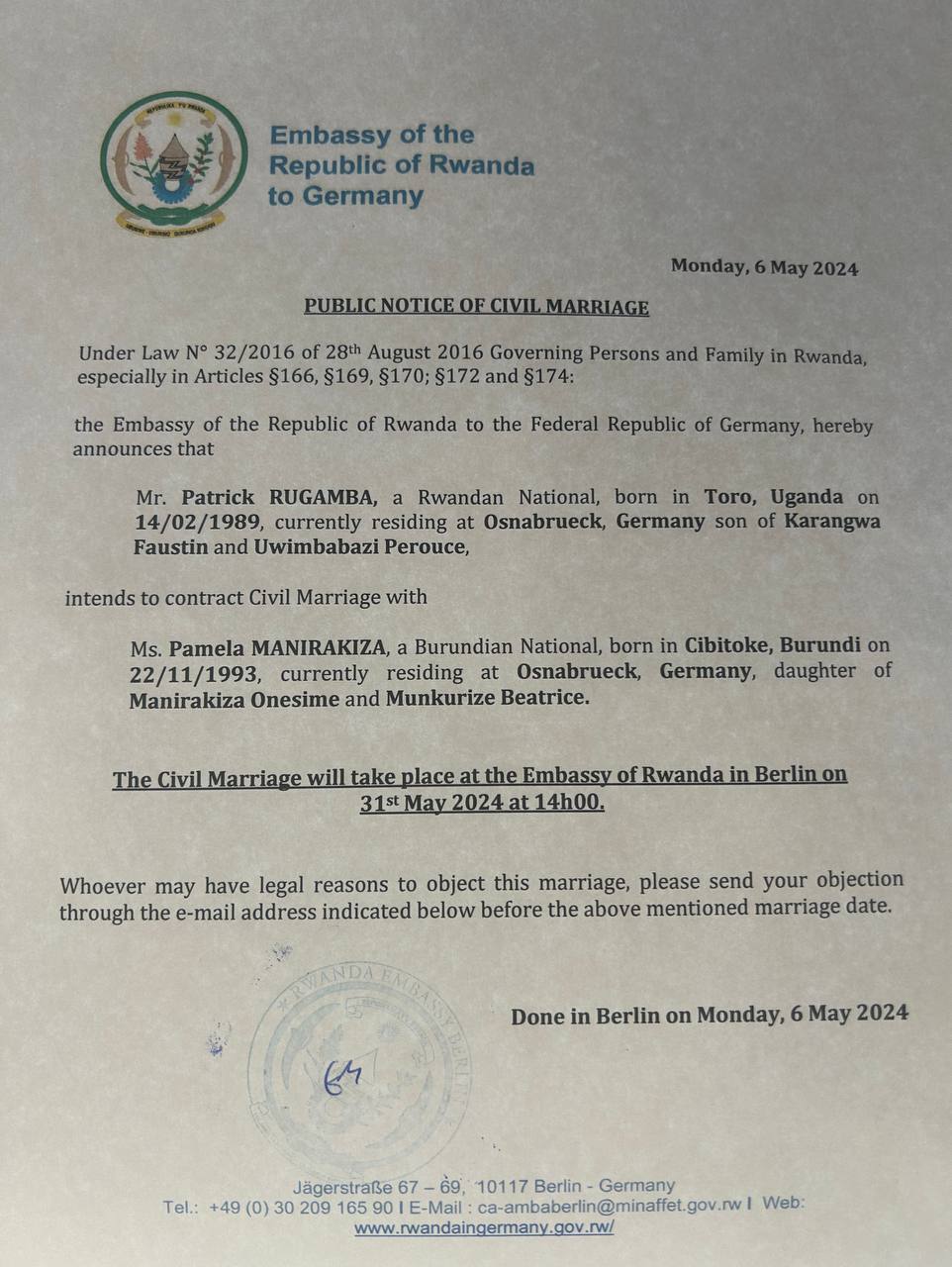 Under Law N° 32/2016 of 28th August 2016 Governing Persons and Family in Rwanda, especially in Articles §166, §169, §170; §172 and §174: the Embassy of the Republic of Rwanda to the Federal Republic of Germany, hereby announces that Mr. Patrick RUGAMBA, a Rwandan National, born in Toro, Uganda on 14/02/1989, currently residing at Osnabrueck, Germany son of Karangwa Faustin and Uwimbabazi Perouce, intends to contract Civil Marriage with Ms. Pamela MANIRAKIZA, a Burundian National, born in Cibitoke, Burundi on 22/11/1993, currently residing at Osabruck, Germany, daughter of Manirakiza Onesime and Munkurize Beatrice. The Civil Marriage will take place at the Embassy of Rwanda in Berlin on 31st May 2024 at 14h00. Whoever may have legal reasons to object this marriage, please send your objection through the e-mail address indicated below before the above mentioned marriage date.